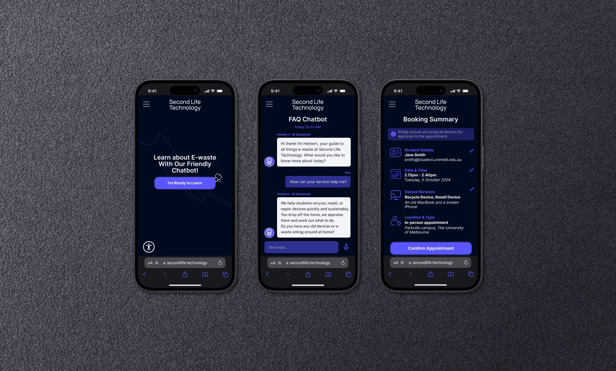 We were tasked with designing a chatbot for a service called Second Life Technologies, a one-stop-shop tech clinic at the University of Melbourne where students can bring their e-waste to be assessed and then refurbished, resold, or recycled depending on condition. The primary goal of our chatbot was to help students use the Second Life Technologies service. A secondary goal was to raise awareness around e-waste, addressing a key insight from our research: many students are unsure what e-waste includes or how to dispose of it responsibly.