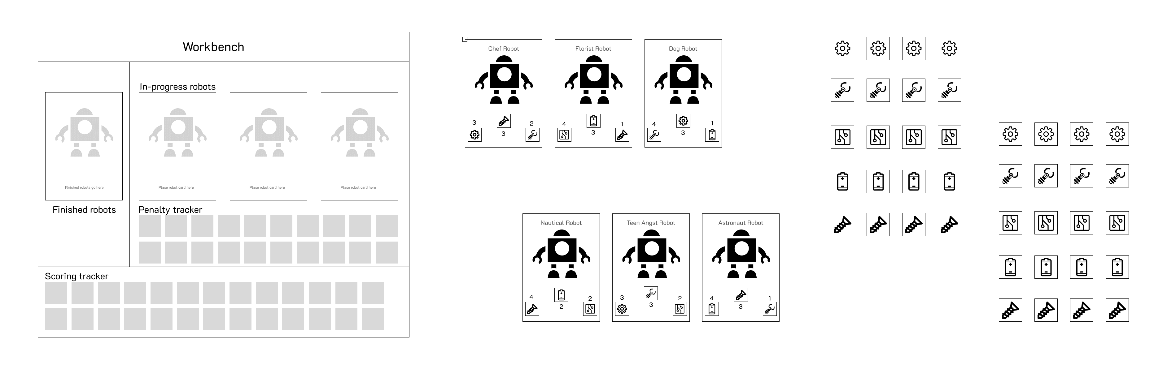 Players still had limited opportunities to strategize and plan ahead. We addressed this by introducing a robot draft (where players can pick from one of 3 robot cards when drawing a new one, rather than drawing one randomly). In combination with robot benefits, this provided additional interesting decisions for players to make on their turn.