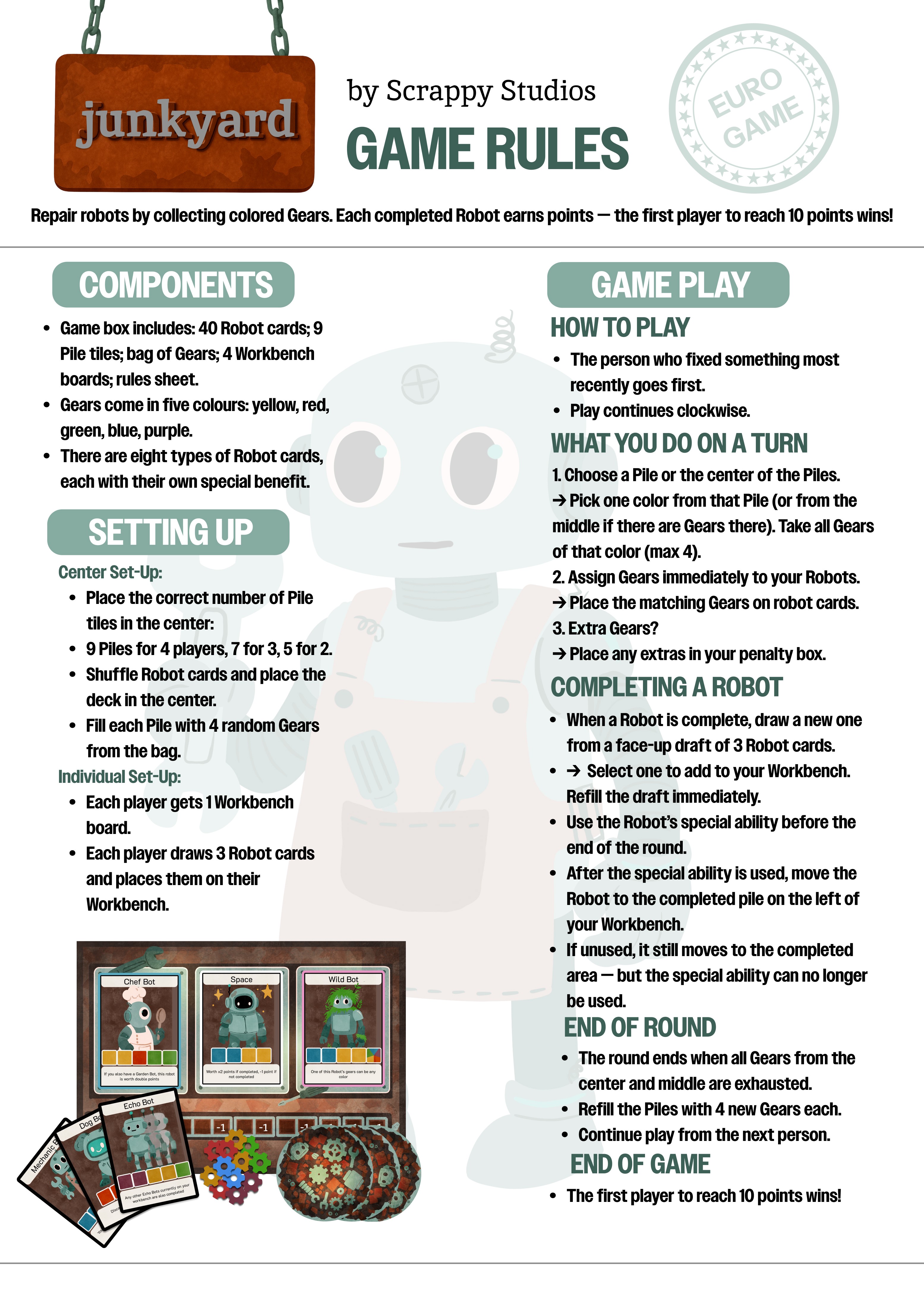 Junkyard is a family drafting game set in a bleak yet heartwarming post-human landscape. Players take on the role of lonely scavenger robots in a trash-covered landscape, picking through scrap piles to salvage gears. With these gears, players repair their fellow run-down robots, each with a unique personality and special abilities that shape gameplay.