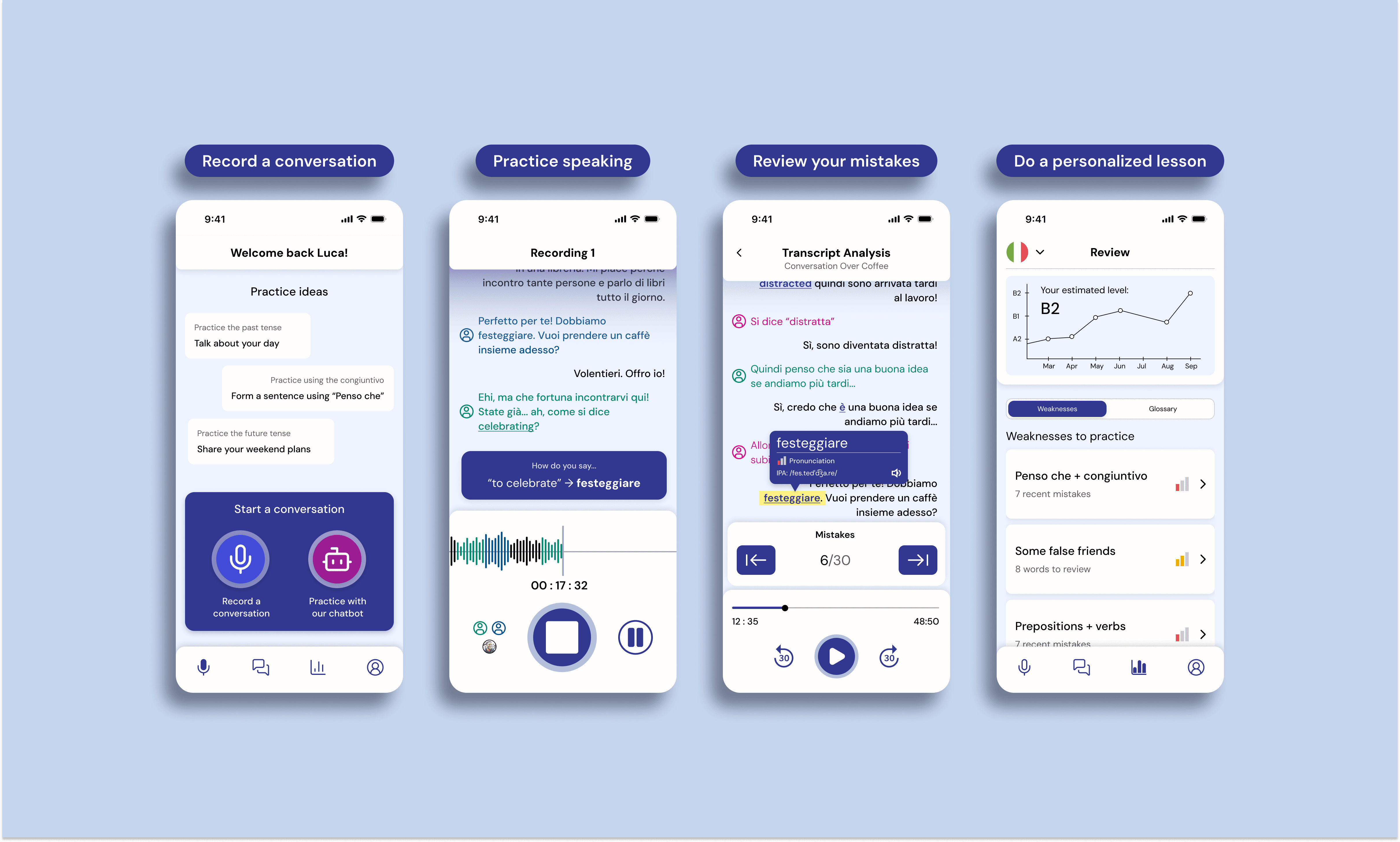 By using samples of their real-life speech to analyze their fluency level (for example, against CEFR level A1, A2, B1, etc.), the app shows users how their conversational fluency level improves over time.