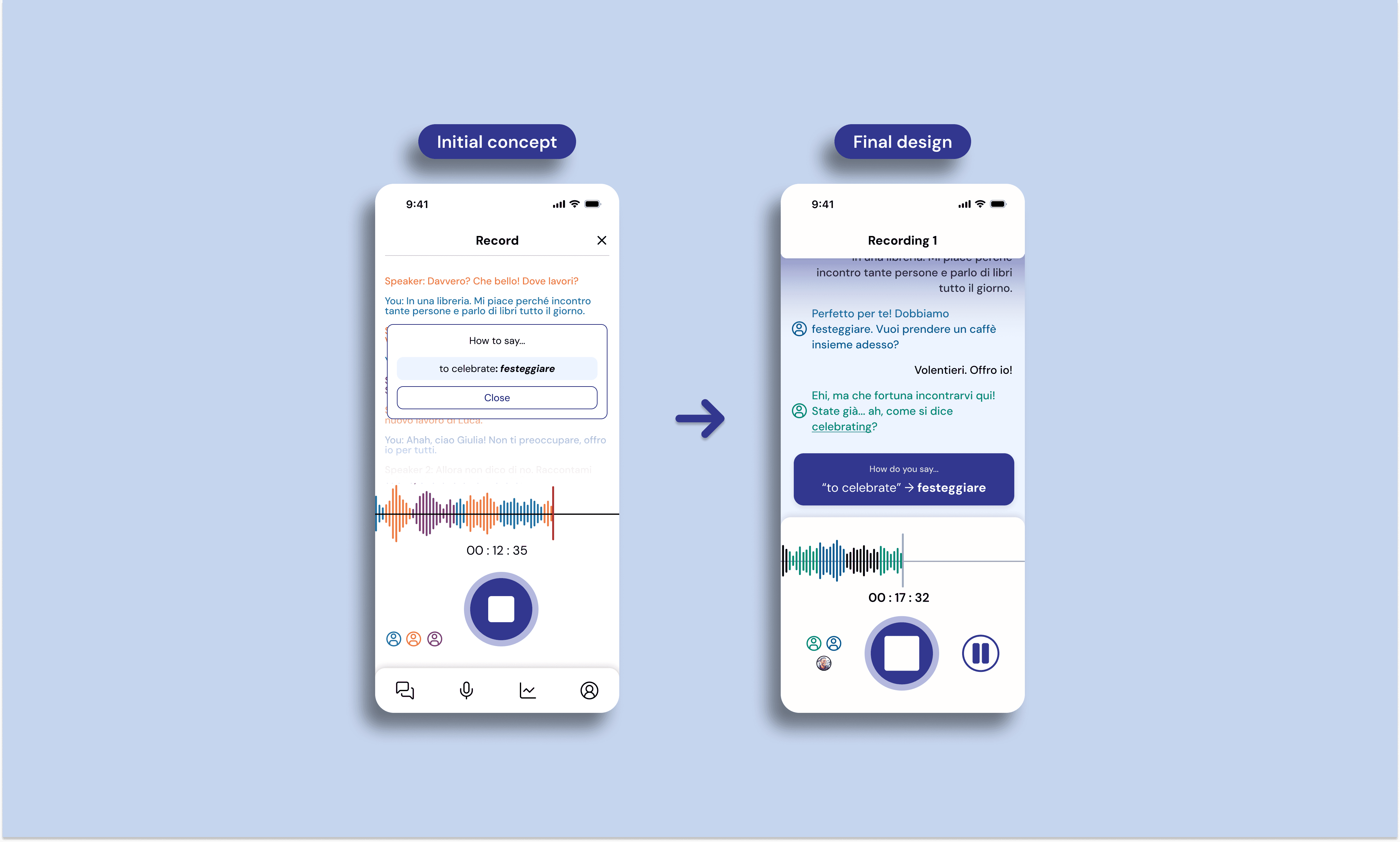 Users press a button to record a conversation in their target language. During the conversation, the app provides support: pop-ups that give translations for words the user struggles to remember ("How do you say…?"), and live transcripts that users can refer to when struggling with auditory comprehension.