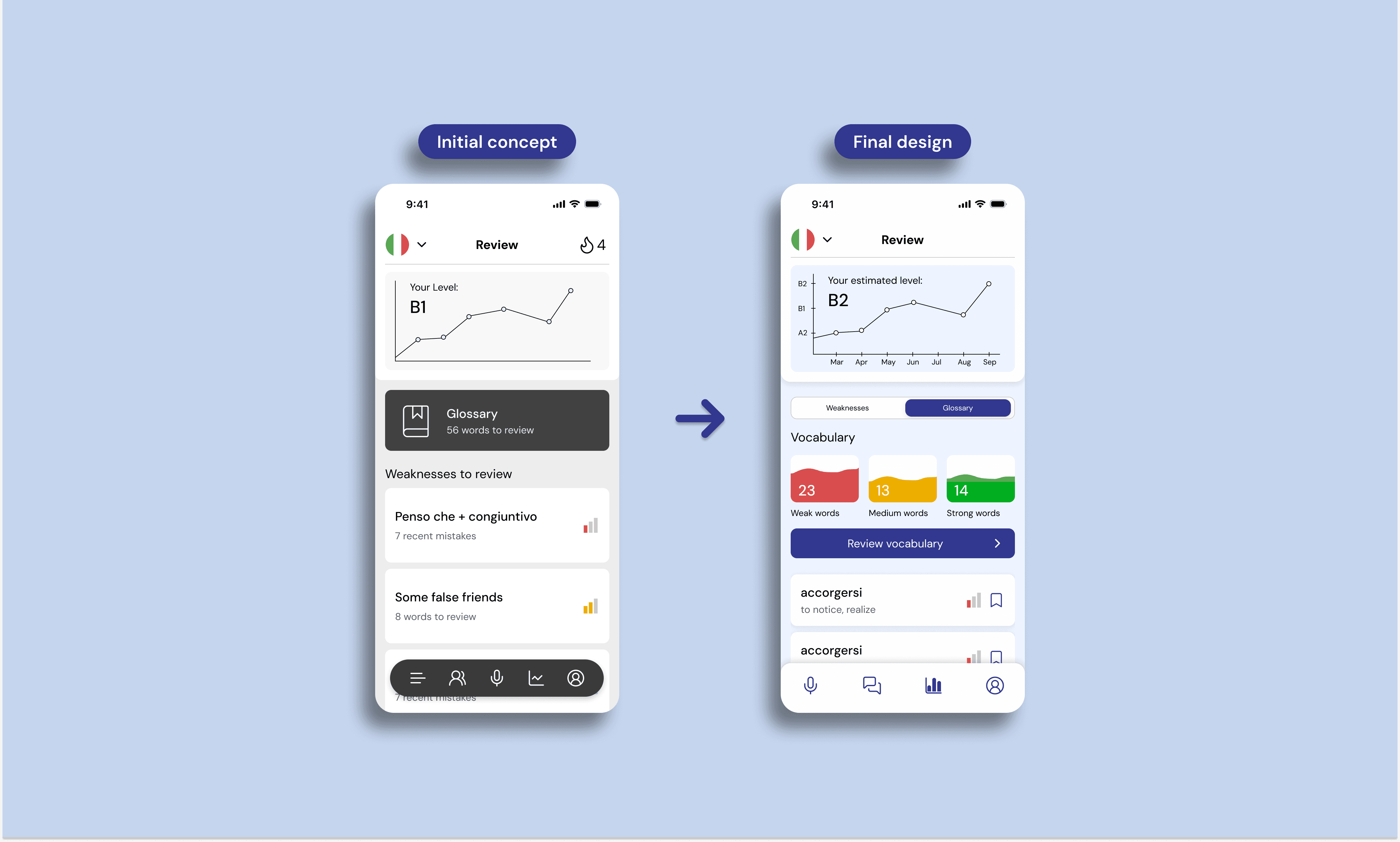 Instead, testing participants responded strongly to progress metrics, describing a sense of motivation and “dopamine” from seeing visualisations such as the progress chart and weakness severity bars. In response, we focused on strengthening this sense of achievement by introducing clearer progress metrics and visual feedback that allow users to reflect on improvement over time, adding motivation without introducing distractions.
